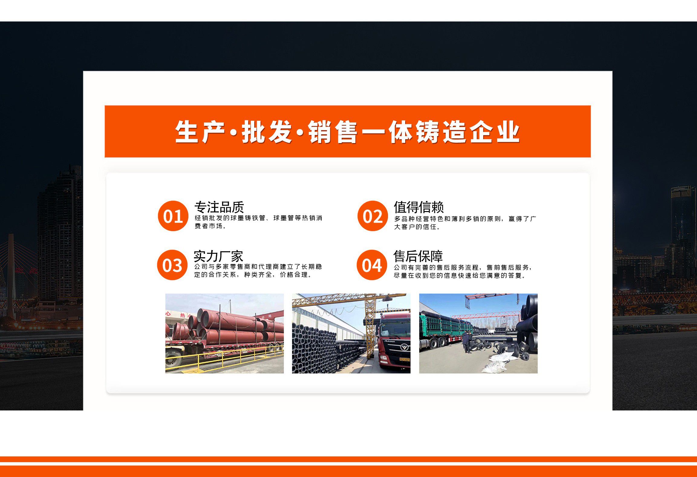 青島金源達管業有限公司主要經營各種規格球墨鑄鐵管,球墨管,球墨鑄鐵管廠家等產品,質量可靠,誠信經營,值得信賴!  青島金源達管業有限公司始終堅持“誠信立業,追求卓越,合作共贏,共同發展”,竭誠歡迎各界朋友來廠參觀指導,洽談業務。我們愿與您攜手共進,互惠雙贏,共創未來!  公司堅持“以奮斗者為本”的理念,關心關愛職工,職工的獲得感、幸福感更加充實、更有保障、更可持續;秉承“忠誠企業、勇于擔當、開拓創新、主動作為”,堅持黨建領航、創新驅動、文化塑魂、奉獻社會,全面致力于綠色、低碳、高效、高質量發展?! ≡概c各界朋友攜手并進,共創未來!...
